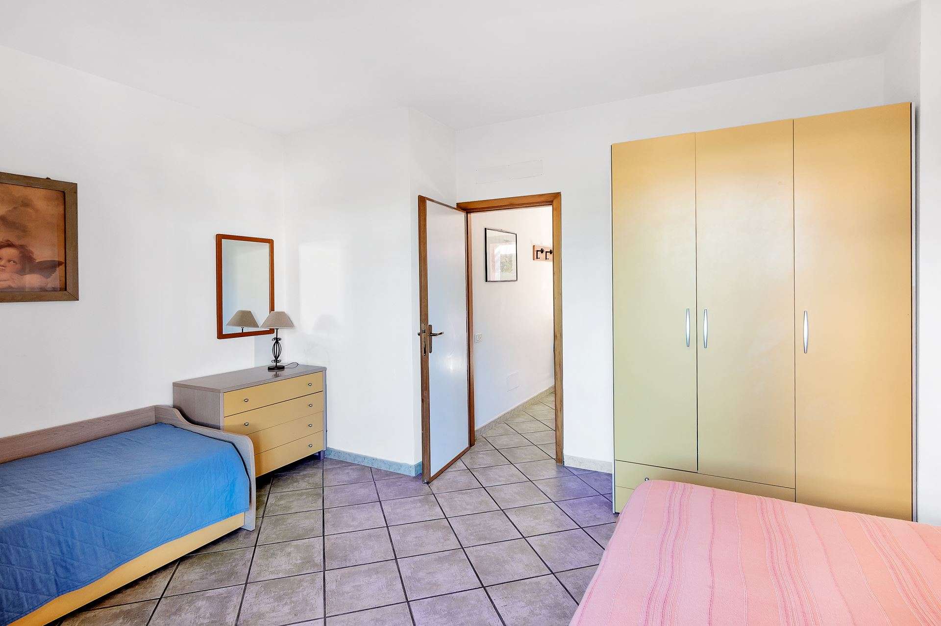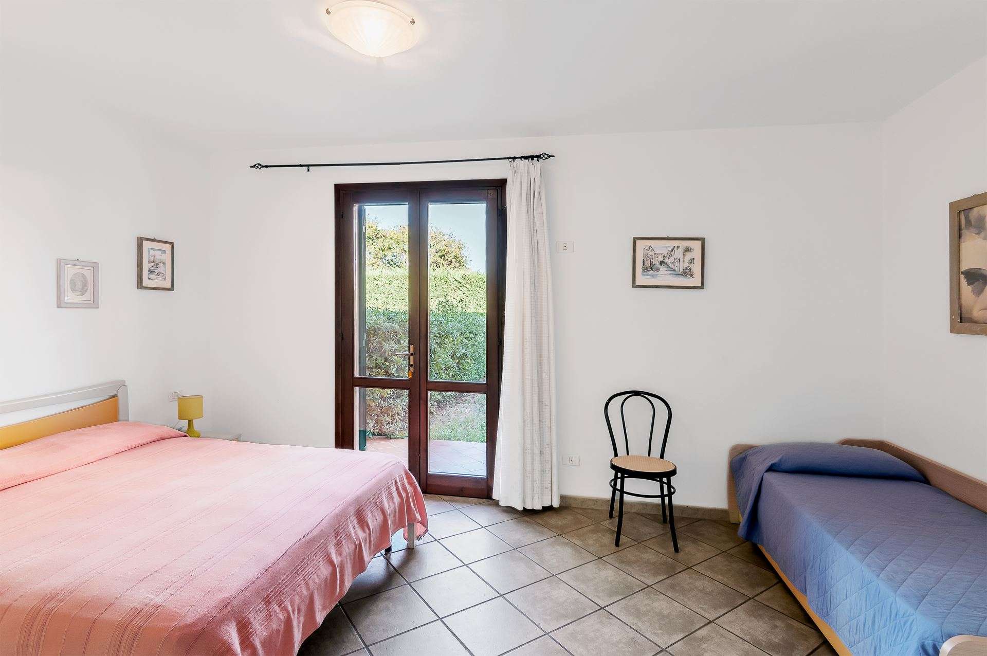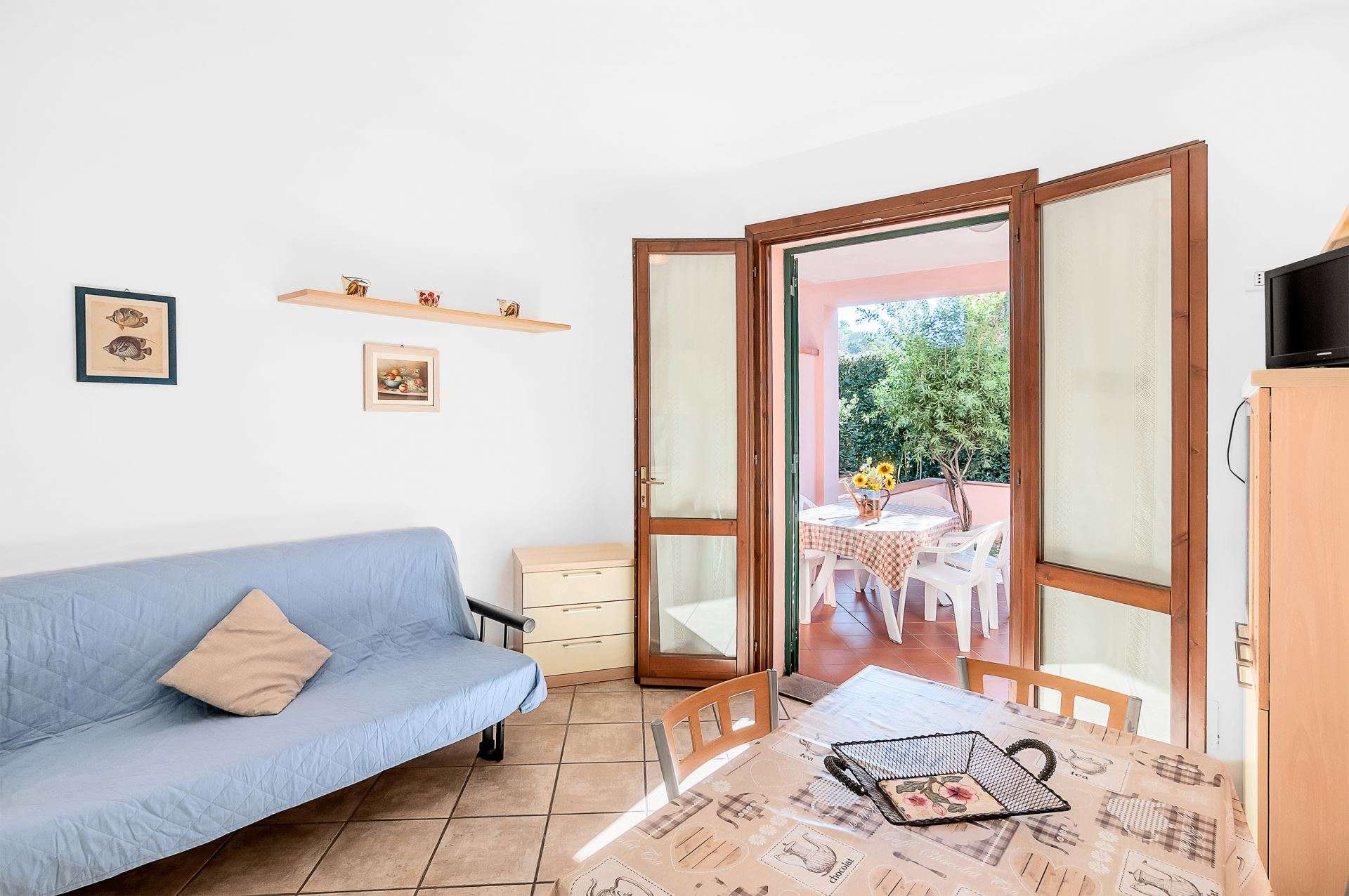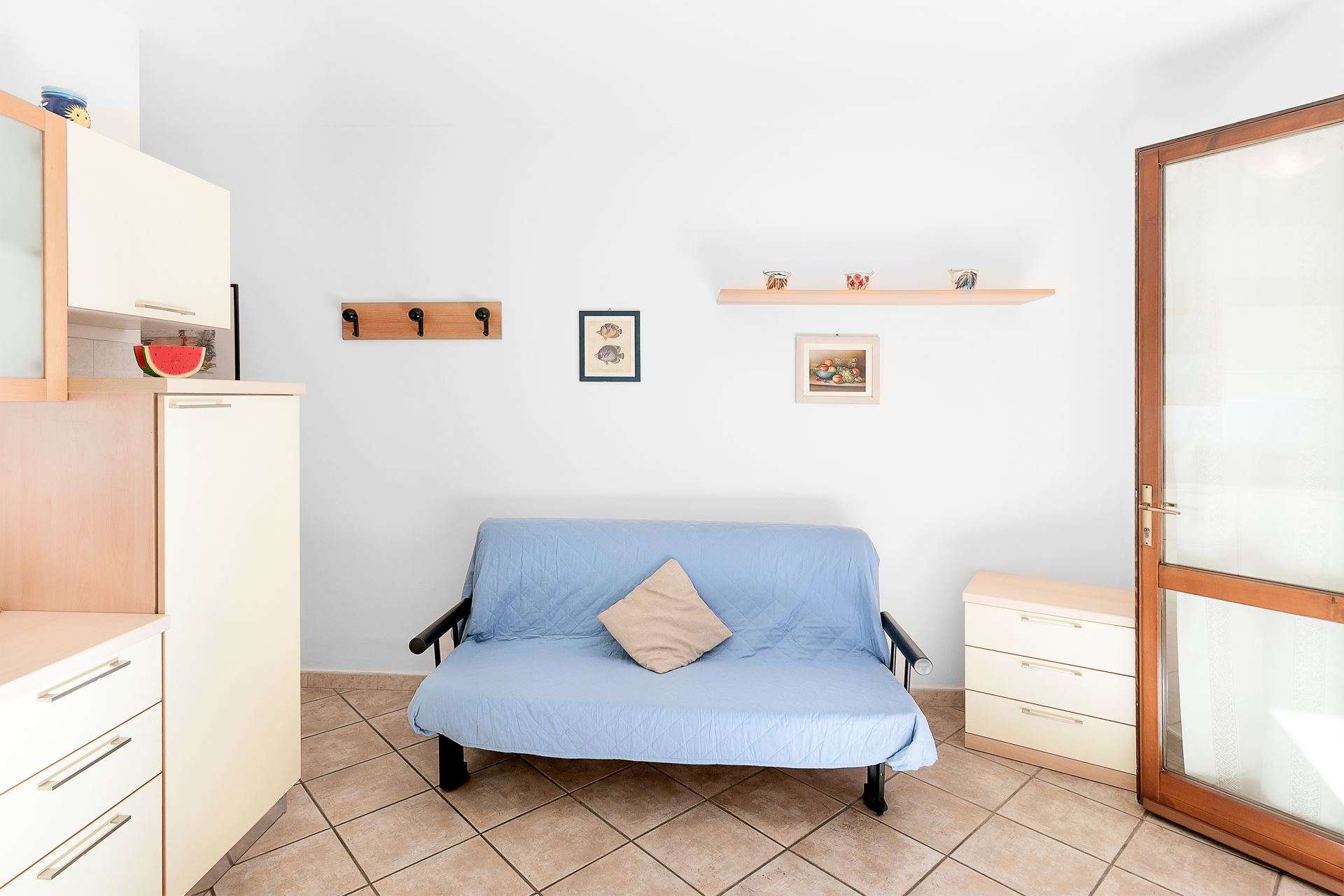 Accogliente appartamento al piano terra di un piccolo complesso residenziale, composto da soggiorno con angolo cottura e divano letto matrimoniale, ampia camera matrimoniale e due letti singoli(a cassetto), bagno con box doccia. Portico attrezzato con tavolo e sedie e piccola area verde sul retro. Dispone di lavatrice, aria condizionata, Tv, posto auto riservato . Animali ammessi con supplemento. Biancheria non inclusa. Non sono accettati gruppi di ragazzi minorenni.