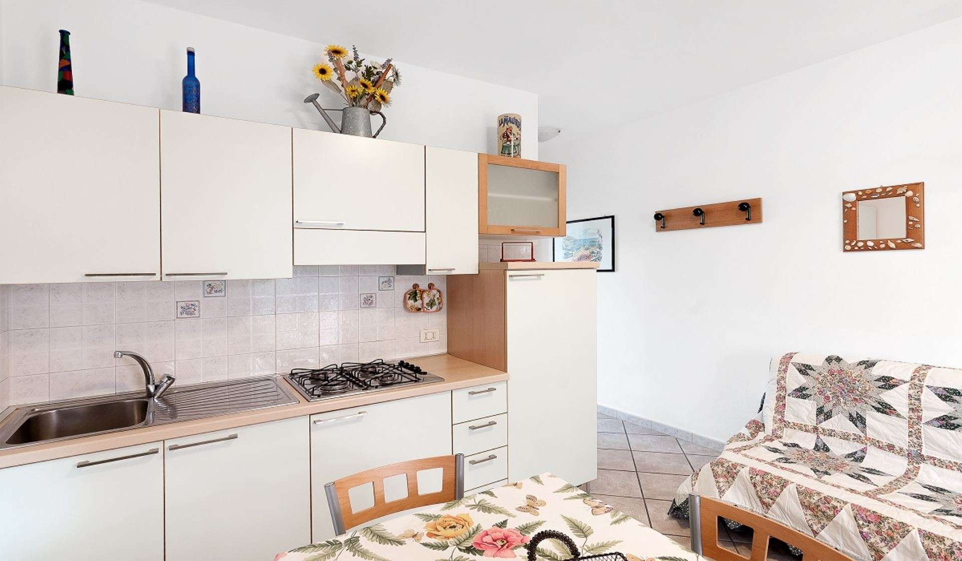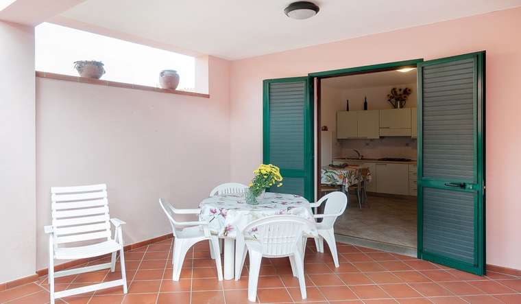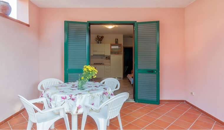 Delizioso bilocale libero su tre lati situato al piano terra di un piccolo complesso residenziale. Composto da soggiorno con angolo cottura e divano letto matrimoniale, camera con letto matrimoniale e mobile letto (ideale per un bambino), bagno con box doccia. Dispone di TV, aria condizionata, lavatrice, portico coperto attrezzato con tavolo e sedie e piccola area verde sul retro. Posto auto. Animali ammessi con supplemento. Biancheria non inclusa. Non sono accettati gruppi di ragazzi minorenni.